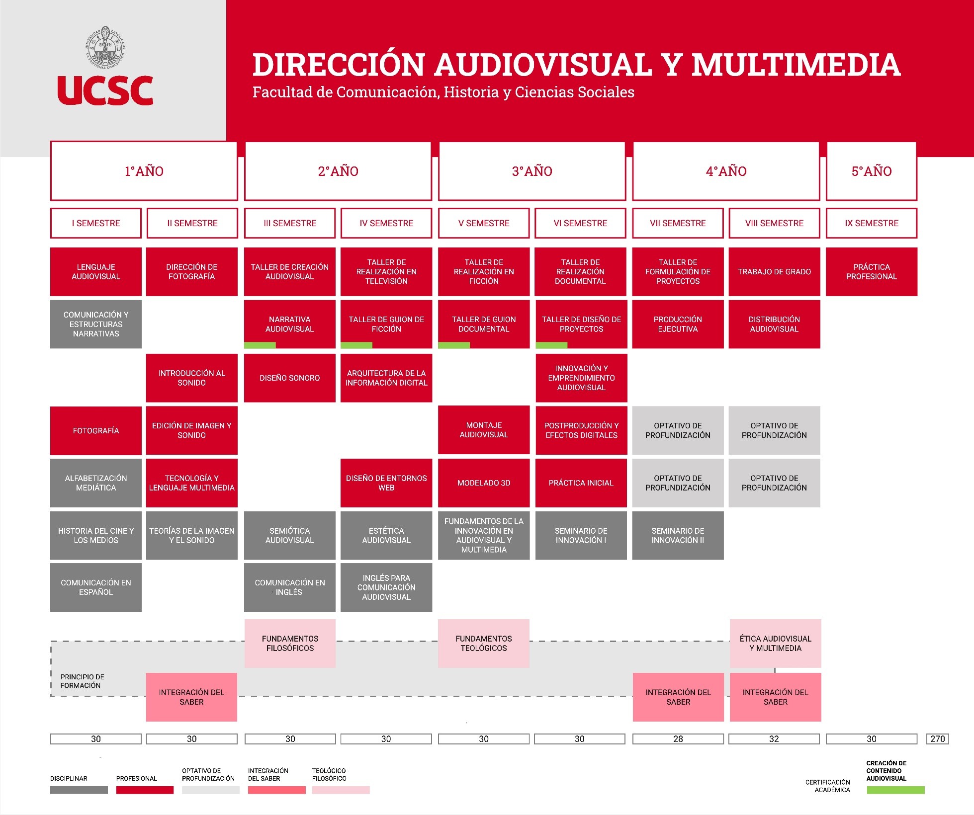 La carrera de Dirección Audiovisual y Multimedia se presenta con un perfil de egreso formulado por resultados de aprendizaje y competencias, cuyo sello distintivo apunta al desarrollo de aspectos éticos valóricos fundados en la Doctrina Social de la Iglesia y del pensamiento estético y creativo. A esto se suma la capacidad para formular y evaluar proyectos conducentes a la autogestión de contenidos audiovisuales y multimedia.